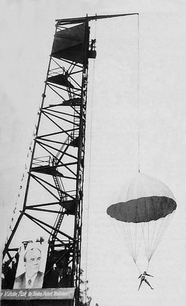 Die Ausbildung beschränkte sich erstmal weiter nur auf Bodenübungen ohne Fallschirme und das Packen weniger alter Schirme aus dem zweiten Weltkrieg. Und dann wurden die ersten Fallschirmsprungtürme errichtet. Bereits am 25.06.1952 versprach man schon in der Zeitschrift „Junge Welt“, dass die Errichtung solcher 30 Meter hohen Übungstürme für den Fallschirmsport in Pankow, auf den Treptower Wiesen und in Köpenick beschlossen wurden, aber da war man wohl etwas zu übereifrig. Der erste Fallschirmstützpunkt kam 14 Monate nach der Gründung der GST am 07.10.1953 im Kulturpark im Küchwald von Karl-Marx-Stadt zur Einweihung, sodass die ersten Sprünge aus 28 m Höhe durchgeführt werden konnten. Auch in der Hauptstadt wollte man den Karl-Marx-Städtern nacheifern und ebenfalls einen Sprungturm Typ-1 errichten. Aber so einfach war die Sache nicht, wie später berichtet wurde: