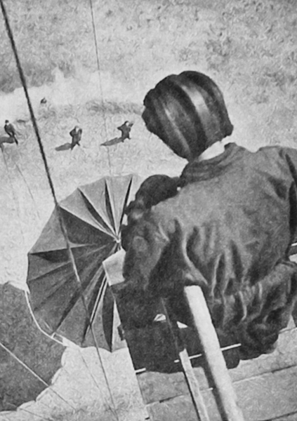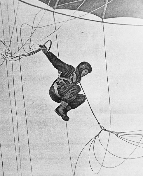 Bild 20 – Emil Schmid bei der Landung mit dem alten Kriegs-Fallschirm im Hinterhof des Zentralvorstandes.
