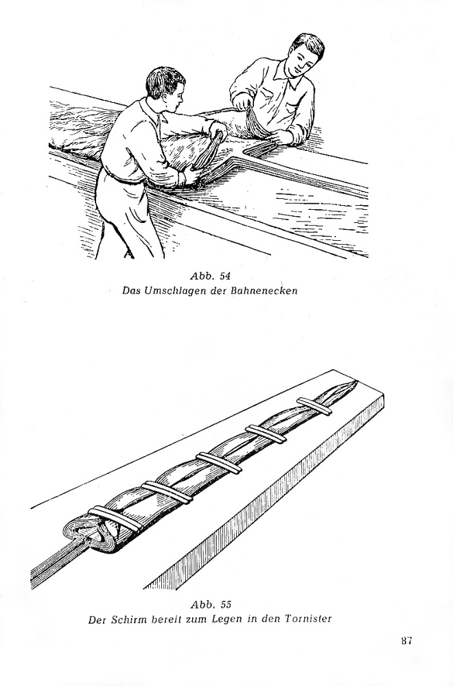 Für das Fallschirmpacken wurde ebenfalls viel Zeit investiert, es kam auf eine gute und saubere Arbeit an. Man musste staunen, mit welchem Eifer die Kameraden dabei waren. Anfangs machte es ja ein wenig Mühe, aber nach etlichen Übungsstunden war auch das überwunden. Alle Kameraden erreichten das Lehrgangsziel, vier Sportler erhielten die Note „mit Ausbildung am Turm“, und vier andere die Berechtigung als Ausbilder „ohne Turm“. Am letzten Abend zeichnete man beim gemütlichen Beisammensein den besten Schüler mit einem Buch aus. Mit diesem Lehrgang wurden neue Kader herangebildet, die im Anschluss dem Fallschirmsport einen wesentlichen Aufschwung geben sollten (8).