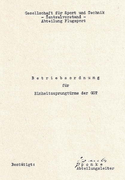 - Zur Durchführung der Sprungausbildung waren Wochenendfahrten zur Benutzung der bereits vorhandenen und noch von den Bezirken aufzubauenden Stützpunkte mit Sprungtürmen zu organisieren. Die Stützpunkte Karl-Marx-Stadt und Berlin-Karlshorst standen bereits zur Verfügung, Halle und Erfurt waren kurz vor der Fertigstellung. Die vorherige Ausbildung an den Bodengeräten war zwingende Voraussetzung für die Teilnahme an der Sprungausbildung vom Turm.