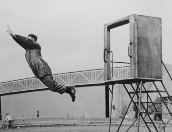 Bild 28 – Absprung eines GST-Fallschirmsportlers am Einheitssprungturm in Gera.