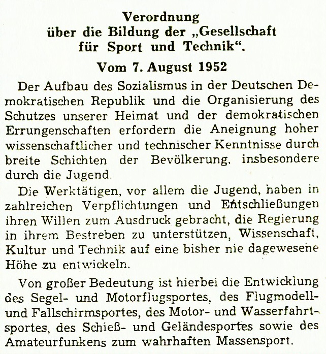 In den Aufzeichnungen von Wilhelm Pieck, erster Präsident der Deutschen Demokratischen Republik, waren Notizen von einer der letzten Besprechungen von Josef Stalin zu finden. Ausgangssituation dieses Treffens zwischen der Nummer Eins der UdSSR und den führenden Politikern der Sozialistischen Einheitspartei Deutschland (SED), welches am 01.04.1952 stattfand, war die verschärfte Situation in Europa nach der Ablehnung der Verhandlungen zur vorgeschlagenen Wiedervereinigung eines dann neutralen „neuen“ Deutschlands. Neben den Maßnahmen zur Aufrüstung der DDR ist ebenfalls die vormilitärische Erziehung der ostdeutschen Jugend in einer zivilen Organisation besprochen worden. Bereits zehn Tage später ist im Politbüro der SED der Aufbau einer freiwilligen gesellschaftlichen Organisation mit dem Titel „Schutz der Heimat“ beschlossen worden, welche in den Sektionen Segelflug, Fallschirmsport, Sport auf dem Meer und den Seen, Motorrad-, Automobil- und Radiosport, Schießsport (Kleinkaliber) und Luftschutz die übertragenen Aufgaben erfüllen sollten.
