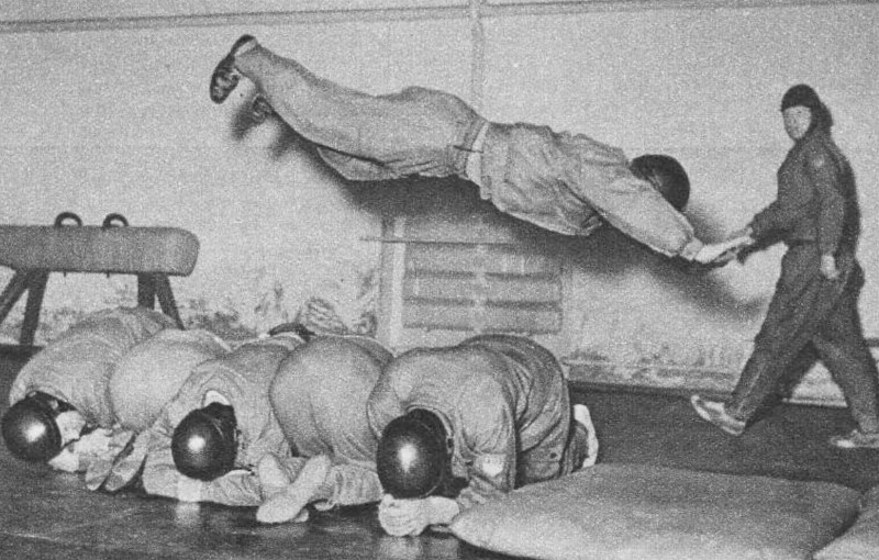 Die ersten 14 Tage waren ausschließlich für die Bodenausbildung an den Geräten vorgesehen. Nach dieser Zeit folgten die Vorbereitungen für die Ausbildung am Turm. Nach einer Schlechtwetterperiode konnte dann der Sprungbetrieb beginnen. Für die meisten war es das erste Mal. Mit großer Sorgfalt wurde von allen Lehrgangsteilnehmern der Sprungturm zum Sprungdienst vorbereitet. Die Kameraden, die zur Sprunggruppe eingeteilt wurden, legten sich gegenseitig das Gurtzeug an. Es folgten die Eintragungen in das Hauptsprungbuch. Nachdem alle Maßnahmen getroffen waren, die zu dem Sprungdienst gehörten, erfolgte die Ersteigung des Turmes. Vom Ausbilder wurden letztmalig Hinweise über das Verhalten während des „freien Falles“ und während des Schwebens gegeben. Auf das Kommando „Sprung“ stießen sich die Sportler vom Podest ab. Nach dem Sprung löste sich die Spannung der Fallschirmspringer und machte der Begeisterung Platz.