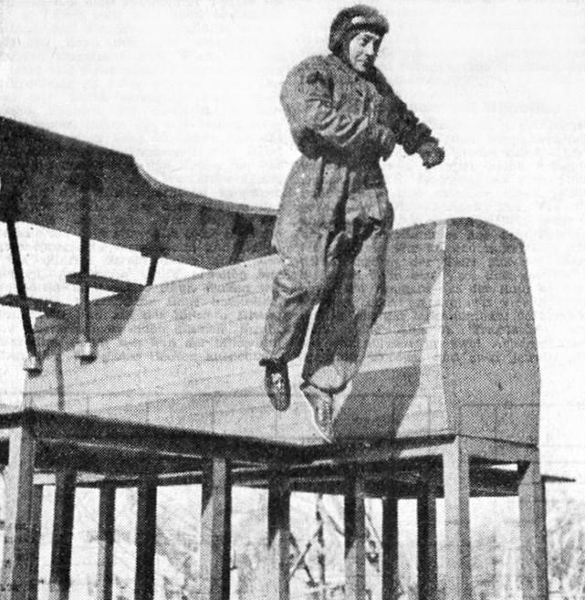 Bild 31– Emil Schmid beim Absprungtraining an der Flugzeugattrappe PO-2.