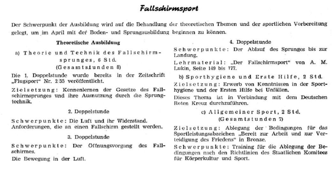 Der erste Lehrplan für die bestehenden Lehrgruppen „Fallschirmsport“ sollte großer Ansporn zur intensiven Trainingsarbeit sein und gleichzeitig neue junge Kameraden in ihre Reihen führen. Man sah es als Anfang für eine systematische Entwicklung des Fallschirmsportes in der Deutschen Demokratischen Republik nach sowjetischem Vorbild.