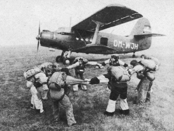 Die Fallschirmsprungausbildung an der neu gegründeten Schule Halle-Oppin begann mit einer Weiterbildung der dortigen hauptamtlichen Fallschirmsprunglehrer und Lehrer aus den Bezirken.