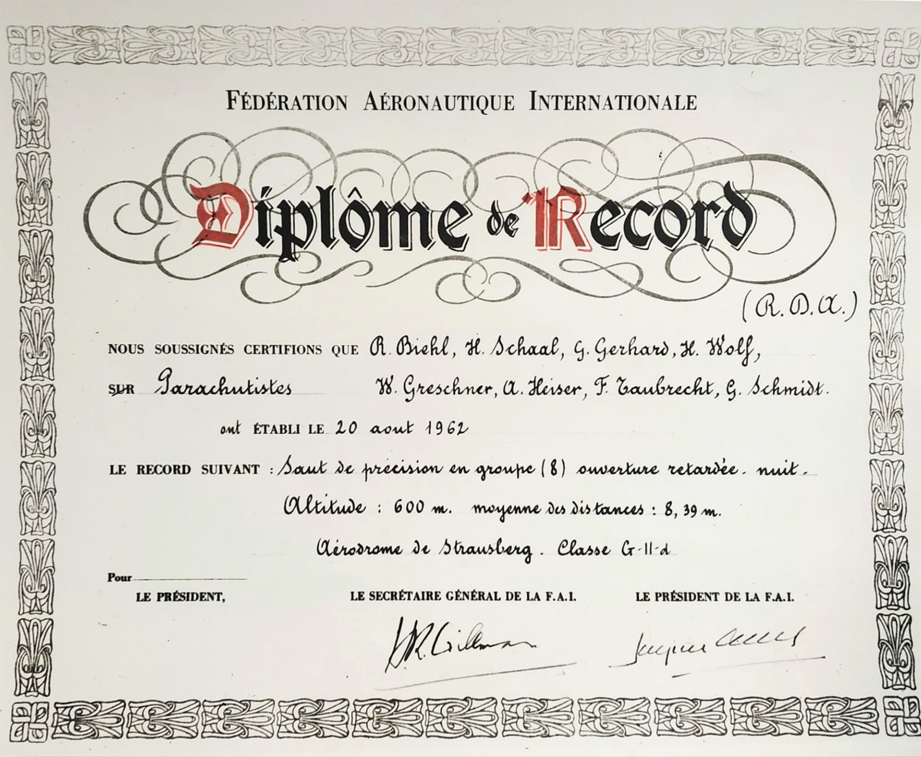 Weltrekord im Gruppenzielspringen aus 600 m Höhe am Tag mit 8 Springern, aufgestellt am 20.08.1962 in Straußberg mit einer Landeentfernung von 8,39 m.