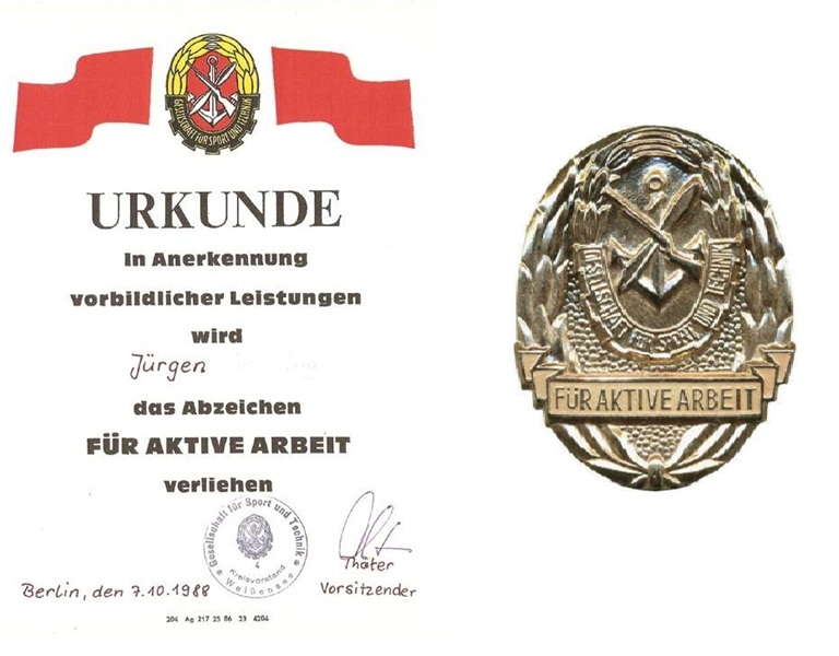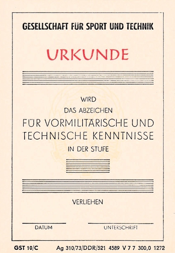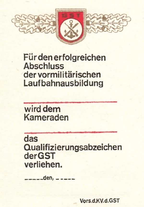 Bilder rechts – Urkunde und Qualifikationsabzeichen der GST in den Laufbahnen mot. Schütze, Nachrichtenspezialist, Taucher und Fallschirmjäger (Abz. ganz oben); Militärflieger (zweites Abz. Von oben); Militärkraftfahrer (zweites Abz. von unten) und Matrosenspezialist (Abz, ganz unten).