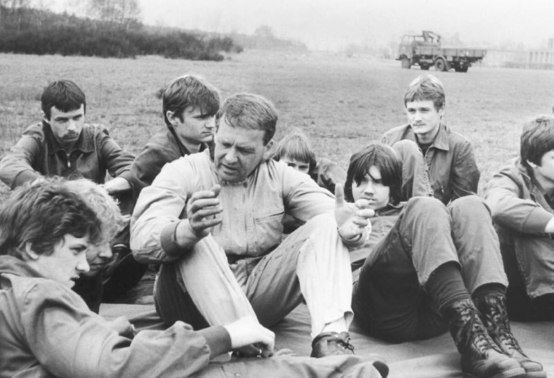 Bild 9 – Oberinstrukteurs Heinz Wolf, Sektorenleiter Fallschirmsprungausbildung im ZV der GST im Gespräch mit jungen Freiwilligen Luftsportlern.
