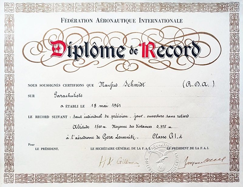 Bild 6 – Das offizielle Diplom de Record zum ersten Weltrekord eines DDR-Fallschirmspringers.