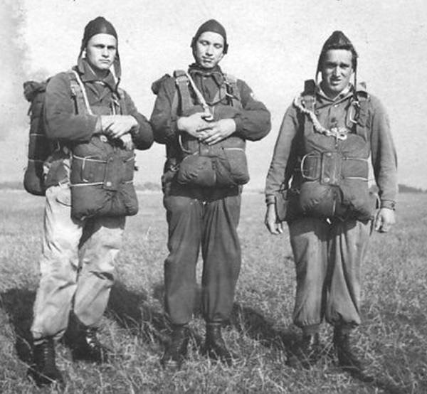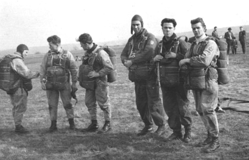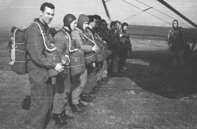 Bild 9: Güstrow 08.März 1961. Ich vorne links in voller Montur und mit PD-47, Ersatzgerät PZ-47 sowie (noch) vollem Haar vor meinem 5. Sprung.