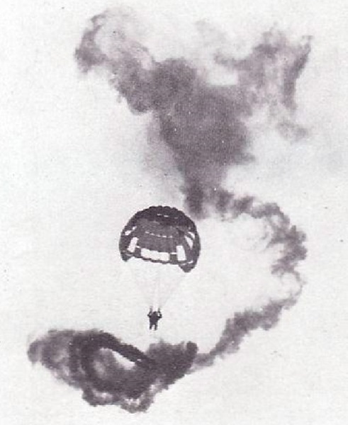 Die Sache sollte vorher zu mindestens einmal geübt werden. Die beiden Maschinen starteten und machten eine große Rechts- Biege über die Innenstadt. Als diese erreicht war, kam ein Schwachkopf von den Magdeburgern auf die Idee, an seinem Rauchkörper herumzufummeln und ihn vorzeitig zu zünden. Ruck- zuck war die Bude in diesem Fall rot und nicht blau. Die Besatzung machte die Tür zum Cockpit zu und überließ die Springer ihrem Schicksal. Diese hielten es nicht lange aus, da der Rauch doch ziemlich atemwegsreizend war. Man war- wie erwähnt- mitten über der Innenstadt in vielleicht 1000m oder tiefer. In den Zentren von größeren Städten sind ordentliche Landeflächen eher selten, also gab es eine Menge kniffliger Außenlandungen. So landete einer mitten auf dem vielbefahrenen Hasselbach- Platz, ein anderer in den Kistenstapeln eines Getränkehandels. Aber es ging ohne Verletzungen ab.