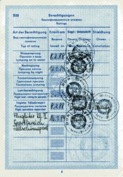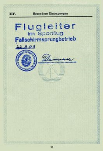 In meiner Fallschirmsprungerlaubnis (Nr. 0166 per 22.3.1963 – ausgestellt vom ZV der GST) wurde mir neben der Sondererlaubnis als Lehrer Fallschirmsprung auch die Sondererlaubnis als Flugleiter im Sportflug Fallschirmsprungbetrieb erteilt, ohne dass ich irgendeine Prüfung als Flugleiter machen musste. Der Erlaubnisschein wurde aller 2 Jahre verlängert. Damit war ich einer der wenigen FS-Lehrer, der auch als Flugleiter eingesetzt werden konnte. Das war für mich eine ungeliebte Funktion, weil man dabei den ganzen Tag nicht selber springen konnte.