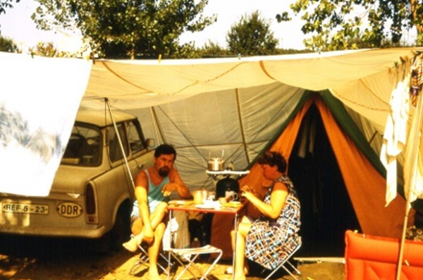 Damit bin ich dann am BAZ alle Typen von GST-Fahrzeugen gefahren: Anfangs die Lkw Robur Granit K30 und IFA H3A, später den Robur LO 3000 und den W50, den Geländewagen P2M und den Trabant Kübel. Mit dieser Fahrerlaubnis konnte ich auch ab 1976 mit dem eigenen Trabi zu Lehrgängen und Sprungveranstaltungen fahren. Irgendwann gab das BAZ Neuhausen abgeschrieben Fallschirme an „verdienstvolle“ FS-Lehrer ab. Da habe ich zusammen mit Volkmar Buse meinen Trabi vollgeladen. Einen RS-4 von der NVA im Ein Strich-Kein Strich-Muster habe ich später mit Klaus Pätzold gegen einen Kompass aus der Jak18 für meinen Trabi getauscht. Ein PD-47 hat mir bei unseren Campingurlauben in Bulgarien gute Dienste als Sonnensegel geleistet. Zwei Bahnen dienen heute noch als Sonnensegel vor der Laube in unseren Kleingarten. Mir hat das Herz geblutet, als ich die Kappe aufgetrennt habe.