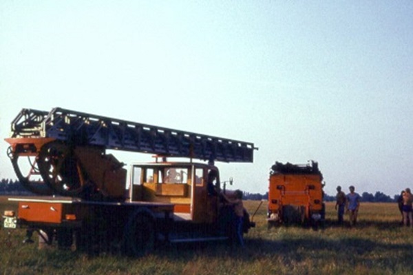 Das Mädchen hing in ca. 13 m Höhe mit beiden Schirmen frei zwischen zwei Bäumen. Nichts zum Heranziehen und nichts zum Abseilen. Da musste die Feuerwehr her. Also fuhr ich rüber ins Objekt, rief die Feuerwehr an und schilderte die Situation. „Wir kommen sofort!“ „Aber bitte nicht mit Blaulicht. Die Leute denken sonst, auf den Flugplatz ist wieder was passiert.“ Natürlich kamen sie mit lautem Tatütata und mit Blaulicht – ein Mannschaftswagen und die Feuerwehr mit der großen Magirus-Drehleiter. Der Wehrleiter meinte: „Wenn wir schon mal in einem Notfall ausrücken dürfen, dann nur mit Sirene und Blaulicht.“