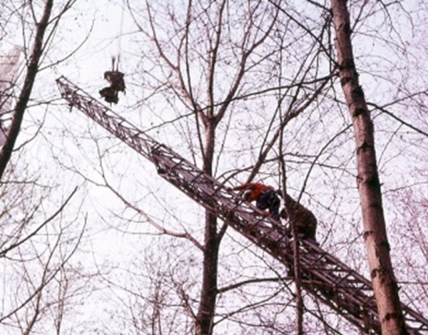 Das Wäldchen steht in einem sumpfigen Gelände. Der Wehrleiter musste erst einen sicheren Standort für den schweren Magirus finden. Der erste Versuch über die Breitseite scheiterte, der Wagen sank ein und drohte mit der hoch ausgefahrenen Leiter umzukippen. Und musste dann mit dem 2. Wagen aus dem Moder gezogen werden. Beim zweiten Versuch konnte der Feuerwehrmann das Mädchen erreichen. Sie gurtete sich auf der Leiter aus und konnte absteigen. Nach fast einer Stunde war sie wieder glücklich am Boden – unverletzt.