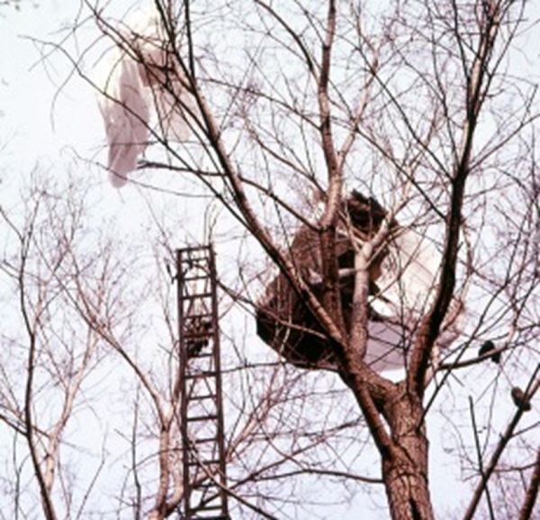 Die Bergung der Fallschirme war ein weiterer komplizierter Akt. Die Länge der Leiter und die Standfestigkeit des Bodens reichten nicht aus, um beide Schirme von oben abzuziehen. Deshalb mussten mehrere starke Äste in den Kronen beider Bäume geopfert werden, um beide Schirme runterzerren zu können – leider nicht unverletzt, sondern mit einigen Löchern und Rissen.