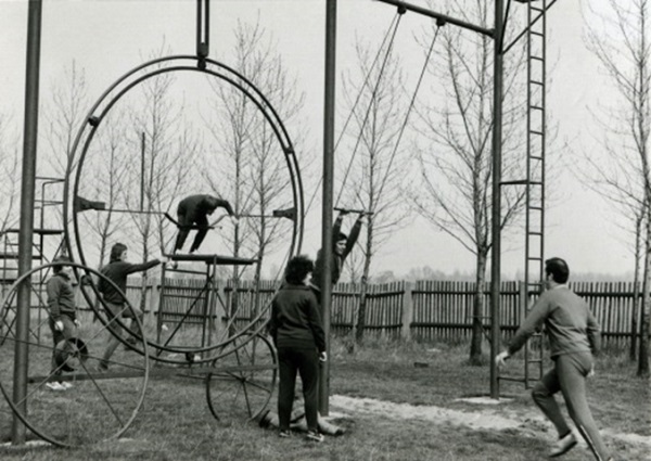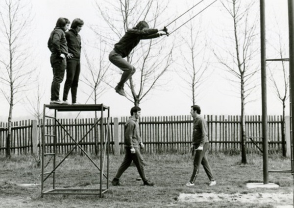 Auch tagsüber konnte schon mal eine Übung mit diversen Einlagen quer durchs Gelände erfolgen. In 2 Gruppen als eine Art Wettkampf. Start mit Überwinden des Rolltores am Objekteingang. Wettrennen paar hundert Meter quer über den Platz, Weitspringen in den Sandkasten, 20 m Kriechen („Robben“) auf dem Bauch. Und dann „Alle Affen auf die Bäume“: Die Gruppe musste so schnell wie möglich auf eine kleine Pappel klettern. Dabei kam es nicht darauf an, weit hoch zu klettern, sondern sich gegenseitig schnell im unteren Bereich zu helfen, bis der letzte die Erde verlassen hatte. Das hinderte aber den Fallschirmjägerbewerber Braun nicht daran, als erster bis in die Spitze zu klettern. Dort brach ein Ast und er fiel aus 6-8 m Höhe – etwas durch Äste abgebremst – mit den Rücken auf die Erde. Schüttelte sich, stand auf, lehnte ein Ausscheiden von der Übung und jede ärztliche Hilfe ab und hat einfach weitermitgemacht. Harte Hund. Das hätte übel ausgehen können.
