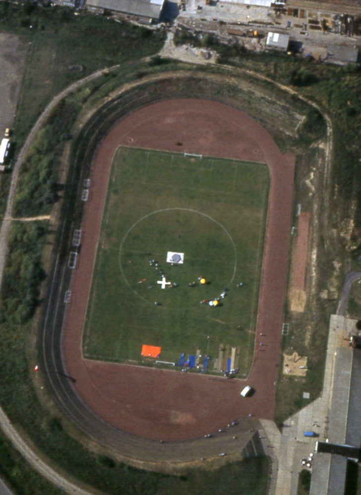 Peter Dank, nunmehr Vorsitzender des Dresdner Fallschirmsportvereines, organisiert in Riesa am 26./27.09.1992 die 1. (und einzige) Sächsische Staatsmeisterschaften in Fallschirmspringen. Alle, die nun eine bundesdeutsche Lizenz haben, sind am Start. Dort treffe ich auch viele alte Kameraden aus dem ehemaligen Bezirk Karl-Marx-Stadt (nunmehr Chemnitz) aus unserer Zeit in Jahnsdorf. Gestartet wird in Riesa-Göhlis, gesprungen aus der Cessna. Es gibt nur die Disziplin Einzel-Zielspringen aus 1.000 m. Ziel ist eine sechseckige Sprungmatte im „Stadion der Jugend“ in Riesa. An beiden Tagen mache ich je 3 Sprünge. Ich laufe als „Sprung-Opa“ mit meinem RL-10 mehr oder weniger außer Konkurrenz.
