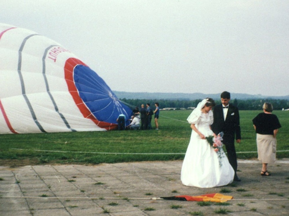 Mittags verkündet der Veranstaltungssprecher, dass alle Paare, die heute ihren Hochzeitstag haben, eine kostenlose Ballonfahrt machen können. Mein Patenkind Claudia Bartsch, die Tochter meines besten Freundes, heiratet heute und ich hätte erst am Abend zu der Feier kommen können. Beim Veranstalter sichere ich mir eine Ballonfahrt und rase mit dem Trabi nach Radebeul in den „Heiteren Blick“. Die Hochzeitsgesellschaft verdaut noch das Mittagessen und das junge Paar kommt gerade vom Fototermin. Ich frage das Brautpaar, ob sie eine Hochzeitsreise in den (siebten) Himmel machen wollen. Dann erkläre ich der verblüfften Verwandtschaft, dass ich nach alter slowakischer Sitte jetzt die Braut entführen werde. Und so rasen wir – ich im Trabi mit Waltraut und Lothar im weißen Wartburg mit Brautstrauß auf der Motorhaube mit dem Brautpaar und seinem Sohn Falko auf den Flugplatz. Dort fahren wir „Parade“ vor Zehntausenden Zuschauern.