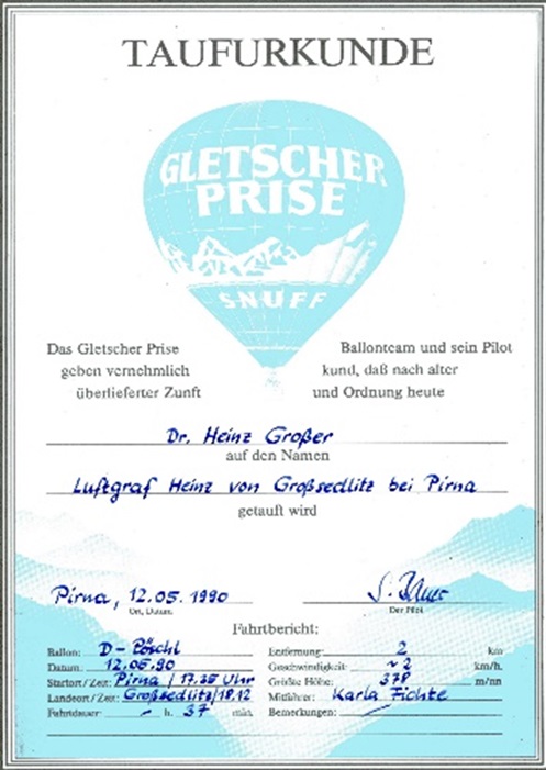 Waltrauts Ballonfahrt holen wir 10 Jahre später am 26.08.2000 nach, als Geschenk zu meinem 60. Geburtstag. Vom Dresdner Elbufer bis hinter Meißen auf der Höhe. Sagenhaft wunderschön. Nun sind wir „Erzherzog Heinz zum japanischen Palais, sächsischer Ballonritter über dem Spaargebirge, Schwertergraf zu Meißen“ und „Fürstin Waltraut von der Augustusbrücke, ballonfahrende Hofdame zu Schloss Wackerbarth, Burgfrau der Albrechtsburg Meißen“.