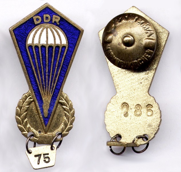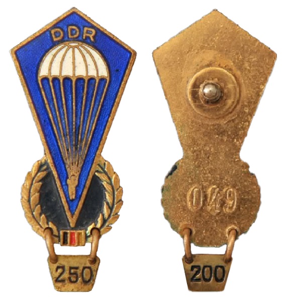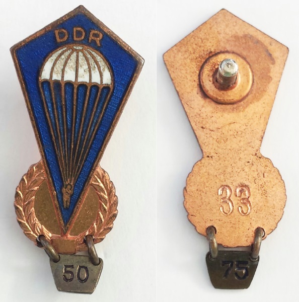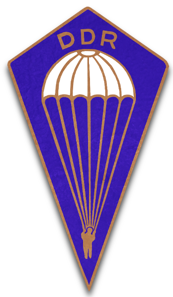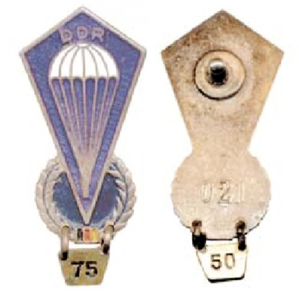 Das Abzeichen in Bronze hatte die Form eines ungleichmäßigen Rhombus. Auf blauem Grund war die weiße Silhouette eines Fallschirmes in Bronze eingefasst. Im oberen Dreieck des Rhombus befanden sich die Buchstaben „DDR“.
