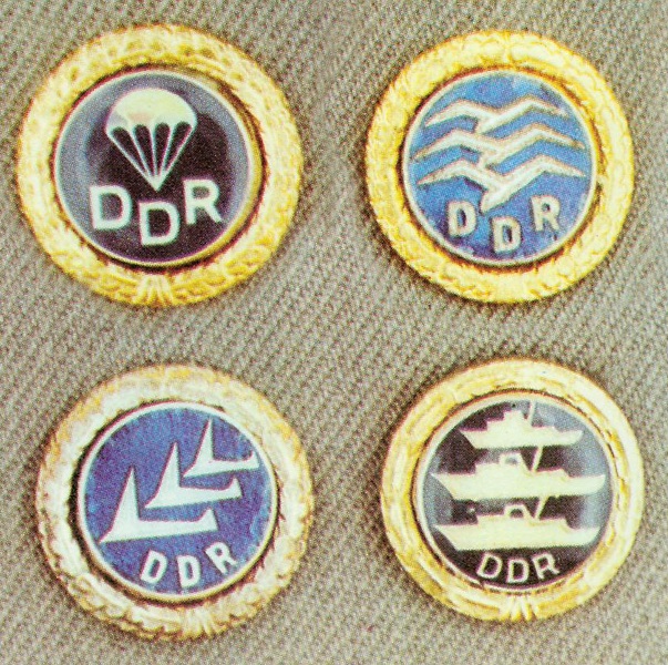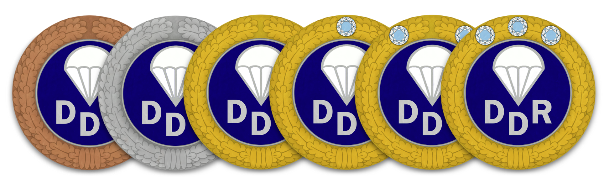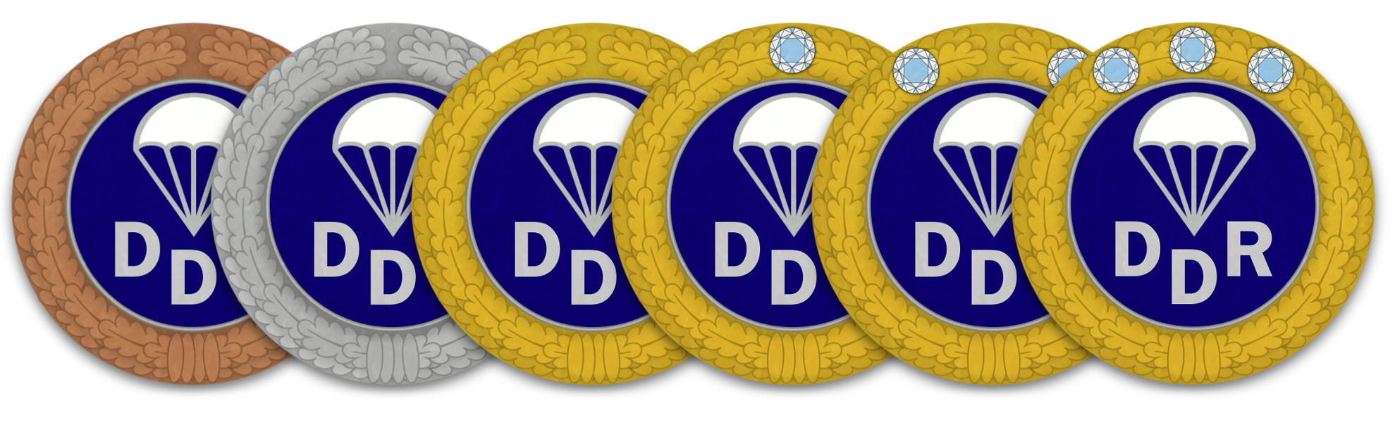 Das  Fallschirmsprungabzeichen in Bronze und das Fallschirmsprungleistungsabzeichen in Silber und Gold wurde auf dem linken Rockaufschlag bzw. auf der linken Brustseite getragen.