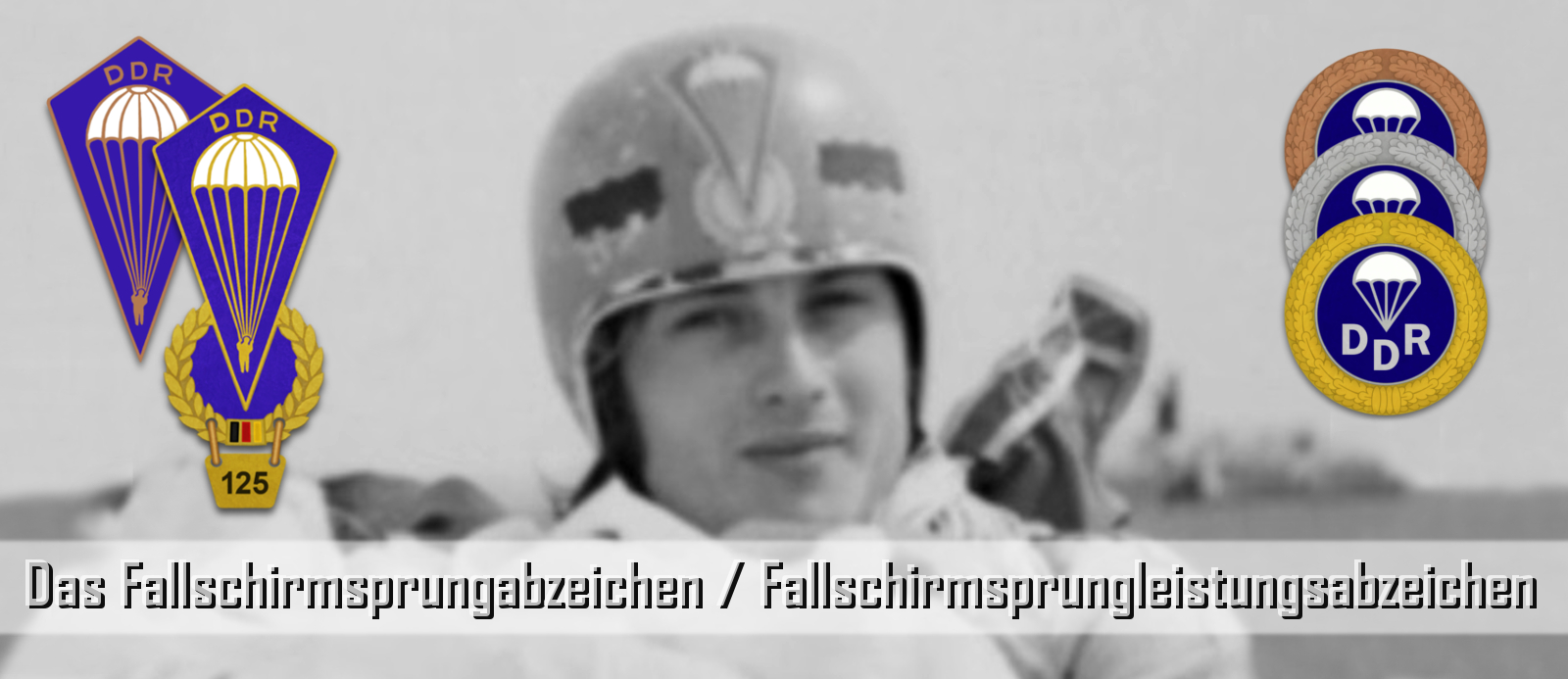 Das Fallschirmsprungleistungsabzeichen in Silber und Gold wurde geprägt und emailliert. Die Form zeigte ebenfalls eines ungleichmäßigen Rhombus und auf blauem Grund ist die weiße Silhouette eines Fallschirms in Silber oder Gold eingefasst. Auch hier befanden sich im oberen Dreieck des Rhombus die Buchstaben „DDR“. Das untere Drittel des Dreiecks war umschlossen von einem offenen silbernen oder goldenen Lorbeerkranz.