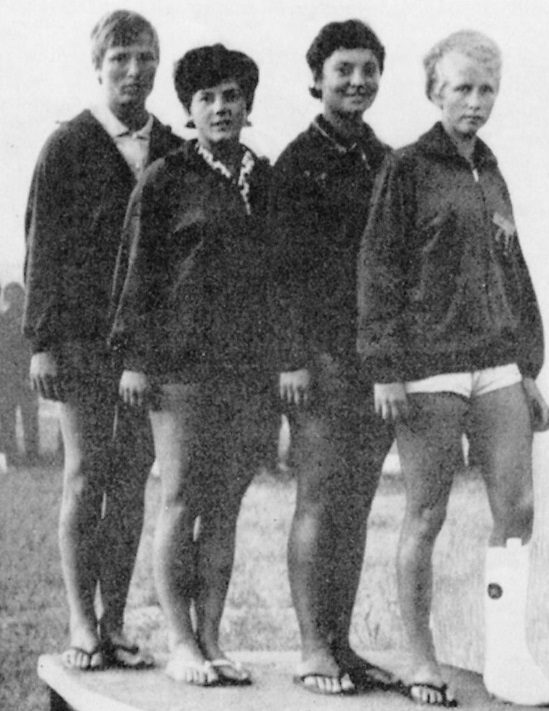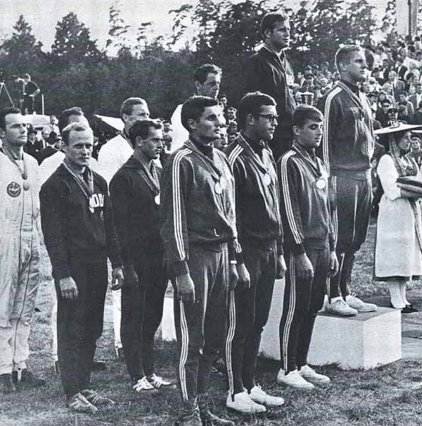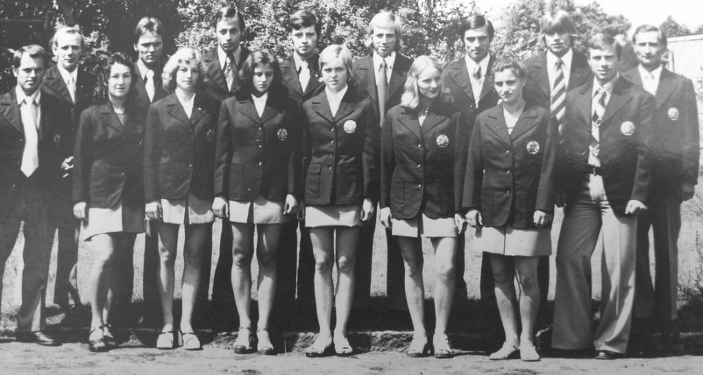 (v.l.n.r.) Rainer Wilde, Karl-Heinz Wolf (von hinten), Klaus-Peter Weidlich, ein finnischer Sportler, Jutta Irmscher, Karl-Heinz Henke,